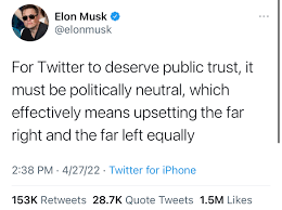 What else is a problem? Elon Musk believing that Twitter has lost public trust because Twitter isn’t politically neutral.