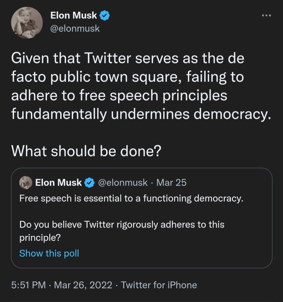This isn’t a minor detail. It tells us a lot about who Elon Musk believes to be “the public”. Is his idea of “the public” merely a homogeneous group of folks who are more likely to be financially well-off by virtue of having a higher level of education than most folks & therefore, unaffected by most of the country’s burning issues?